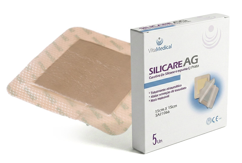 O SILICARE AG é um curativo de espuma tridimensional de poliuretano, revestido por uma película adesiva de silicone hipoalergênico e uma película externa semipermeável. É uma barreira antibacteriana/ antiviral e hidrofóbica. Absorve e retém eficazmente todo o exsudato oriundo da ferida, promovendo a umidificação necessária para o processo de cicatrização e a diminuição do odor liberado pela lesão. Aderência segura e eficaz que permite trocas suaves sem causar lesão ao tecido, propiciando a realização o menos dolorosa possível do procedimento. Pode ser reposicionado sem perder as propriedades aderentes.